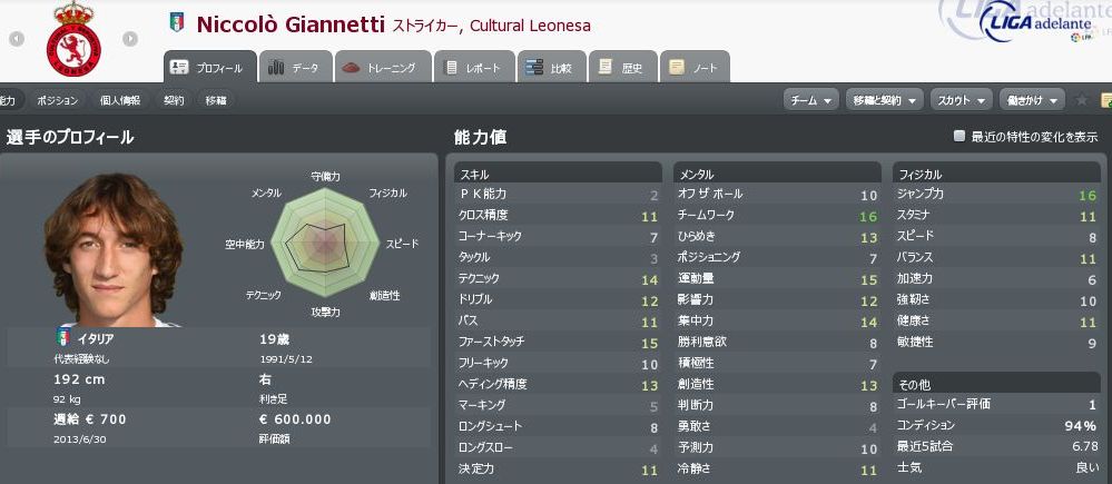 | Niccolo Giannetti | ST | ITA | 19 | 675K | チームワークに長けている長身の若手FW。成長に期待。 |