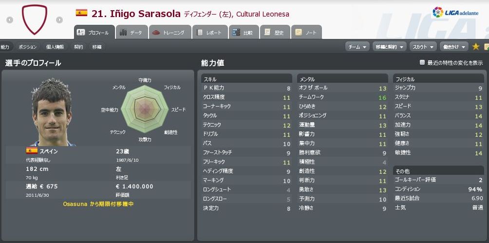 | David Bandera | AM LC | ESP | 22 | 100K | 創造性だけだが、これがいい仕事するんだよね・・・ |