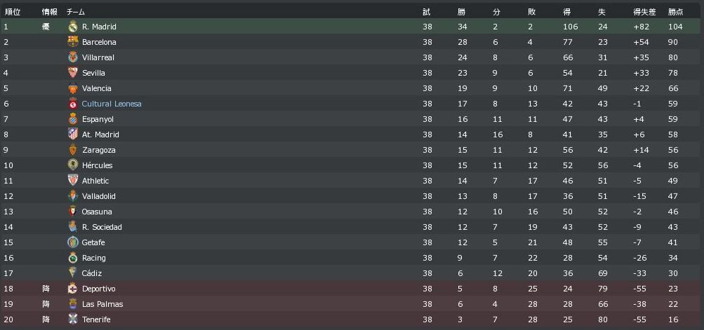7位Espanyolとは直接対決の結果(ホーム引き分け、アウェイ勝利)でこちらが6位となった。