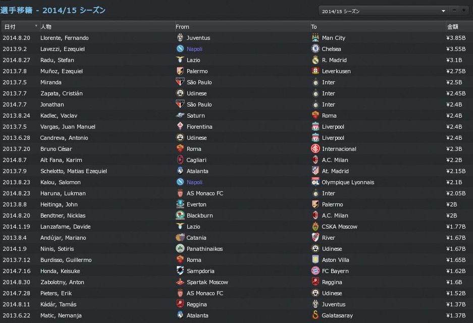 サンプドリアはカッサーノ君が健在。(リアルでは会長と喧嘩して放出)